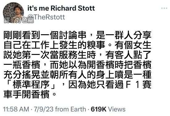 往好處想,至少那位服務生愛看的是F1賽車,而不是船隻進水式